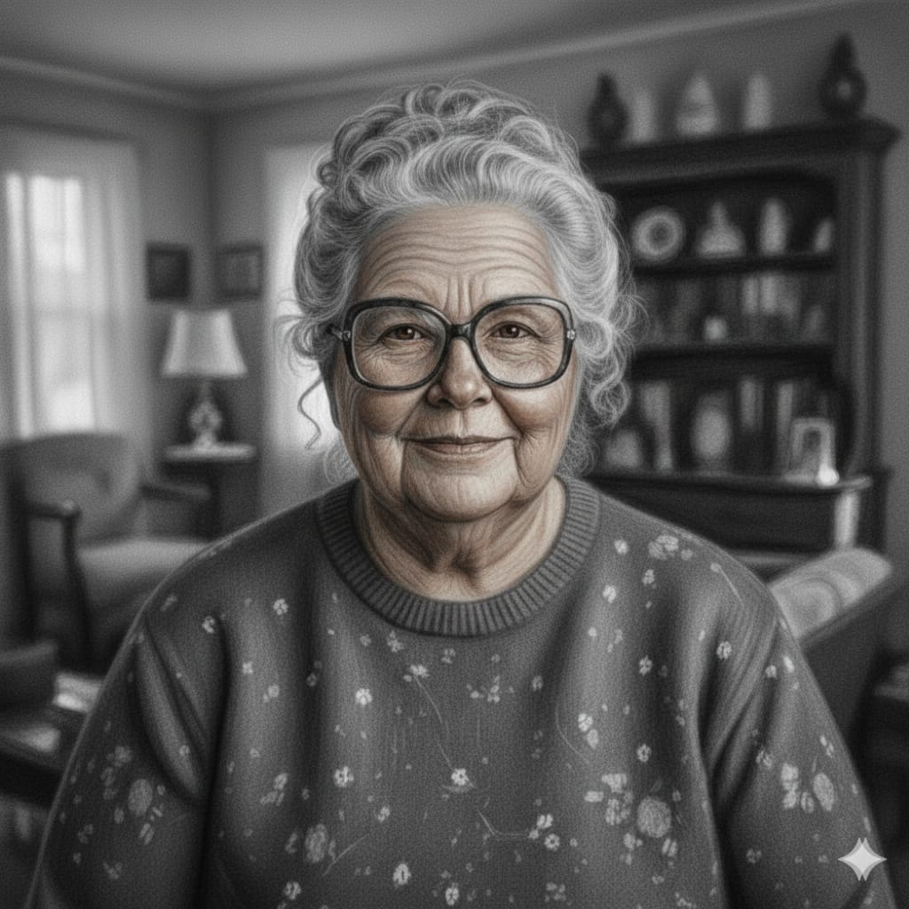 Redonda de carnes, bordeando los setenta años, grandes y gruesos lentes con montura de Carey, pelo corto, algo rizado, recogido en un moño a tenor de la usanza de las abuelitas y de hablar educado con un toque caraqueño, pese a haber nacido en un caserío del extinto Distrito Buchivacoa del estado Falcón.